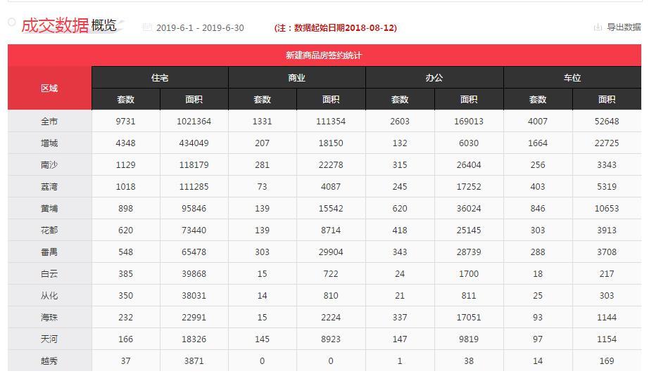 (3)办公房地产市场。据网易房产数据中心显示,6月广州市成交新建写字楼成交套数为2603套,成交面积为16.90万㎡。其中,黄埔、花都、南沙成交分列前三位。