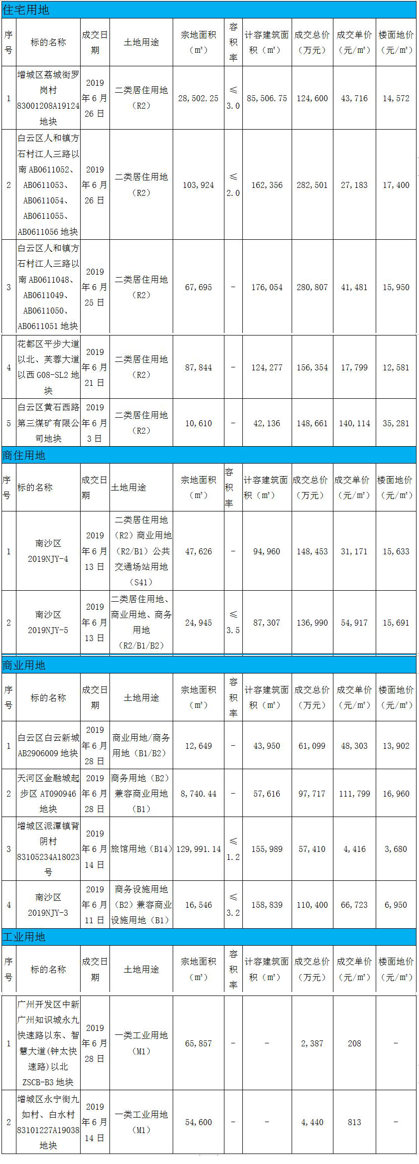 据广州市公共资源交易网数据,2019年6月广州市公开出让成交各类宗地共13宗,其中住宅用地5宗、商业用地4宗、商住用地2宗、工业用地2宗,涵盖区域有天河、白云、增城、花都、南沙、开发区等区域。
