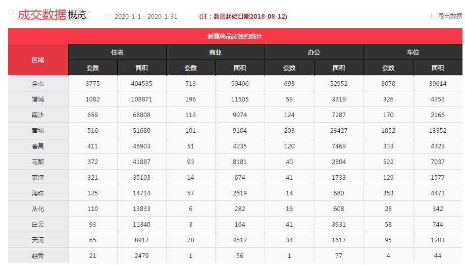 (1)住宅房地产市场。据国家统计局数据,2020年1月广州市新建商品住宅销售价格环比上升0.3%,较去年同比上升4.2%,其中90㎡以下住宅价格环比上升0.5%,90-144㎡住宅价格环比上升0.4%,144㎡以上住宅价格环比上升0.2%。另据网易房产数据中心资料显示,1月广州市新建商品住宅签约套数共3775套,成交面积40.45万㎡。其中,增城、南沙、黄埔三区签约成交位列全市前三位。