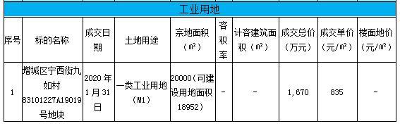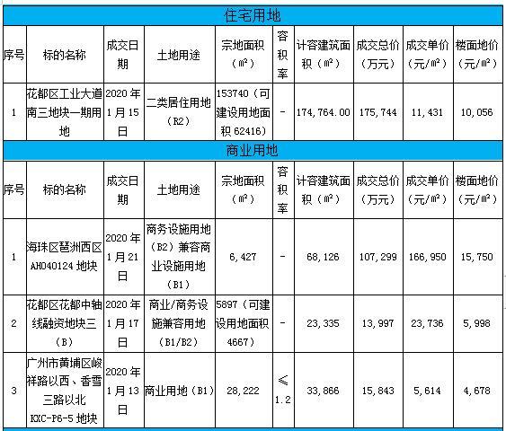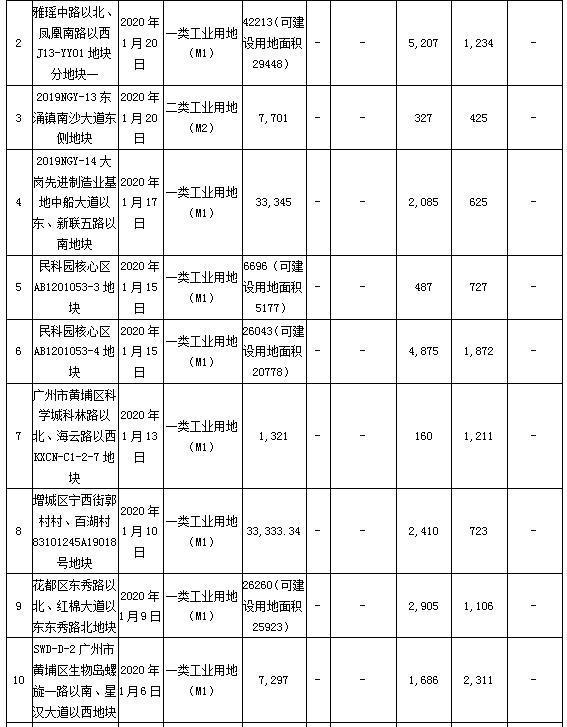 据广州市公共资源交易网数据,2020年1月广州市公开出让成交各类宗地共16宗,其中住宅用地1宗、商业用地3宗、公共服务用地1宗、工业仓储用地11宗,涵盖区域有黄埔、白云、增城、花都等区域。