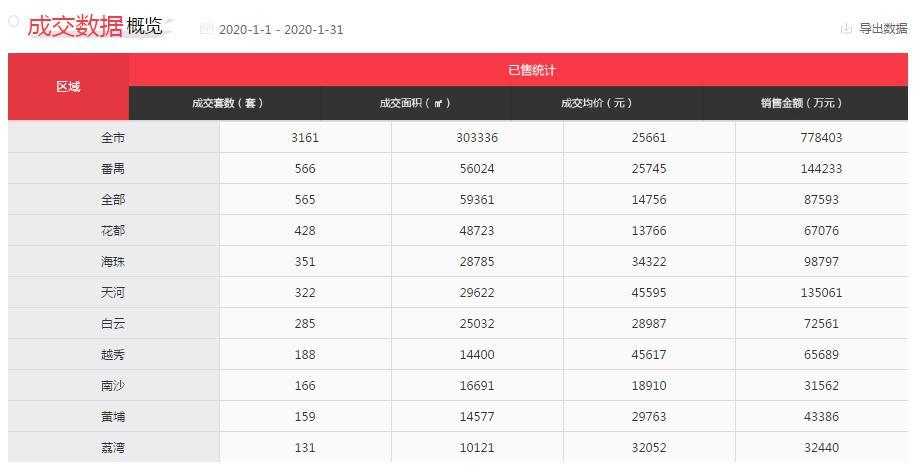 (1)住宅房地产市场。据网易房产数据中心资料显示,1月广州市二手住宅共成交3161套,成交面积为30.33万㎡,成交均价约25661元/㎡。