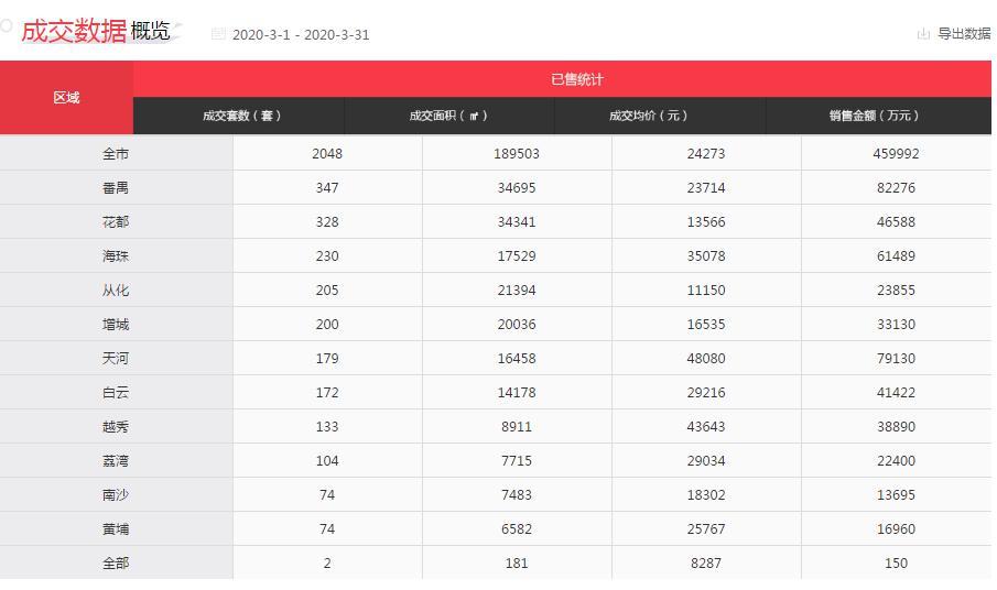 其中,番禺区以347套的成交套数位列榜首,而天河区则以48080元/㎡的成交均价夺得全市楼价之冠。