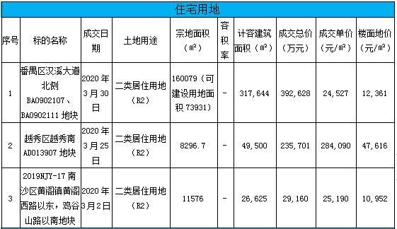 据广州市公共资源交易网数据,2020年3月广州市公开出让成交各类宗地共21宗,其中住宅用地3宗、商业用地5宗、工业用地13宗,涵盖区域有越秀、白云、从化、黄埔、开发区、花都、番禺、南沙、知识城等区域。