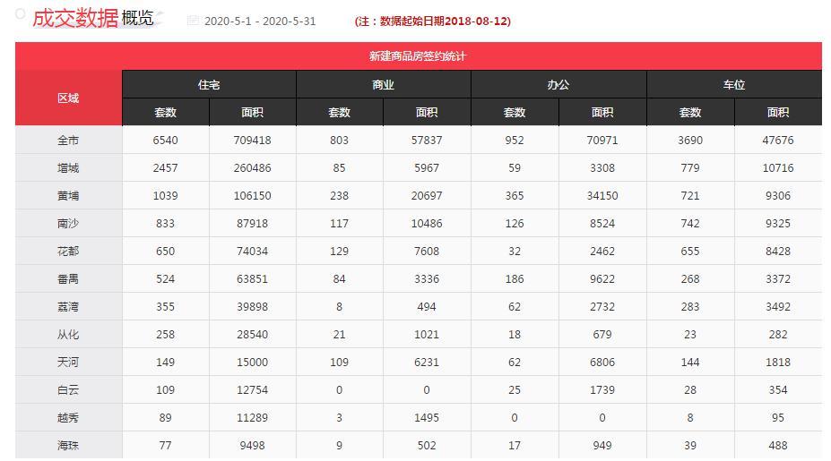 (2)商业房地产市场。根据网易房产数据中心资料显示,5月广州市新建商业房地产共签约803套,成交面积为5.78万㎡。其中,黄埔、花都、南沙三区签约成交分列全市前三位。