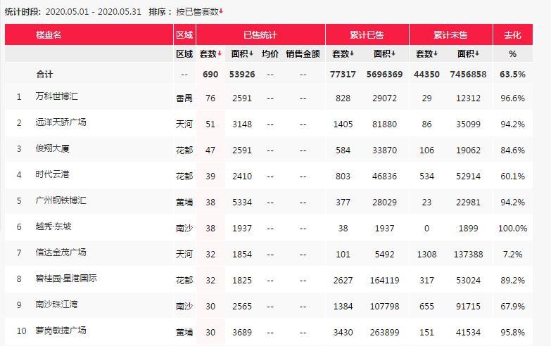 成交量方面,番禺区的万科世博汇和天河的远洋天骄广场、花都的俊翔大厦分列前三位。