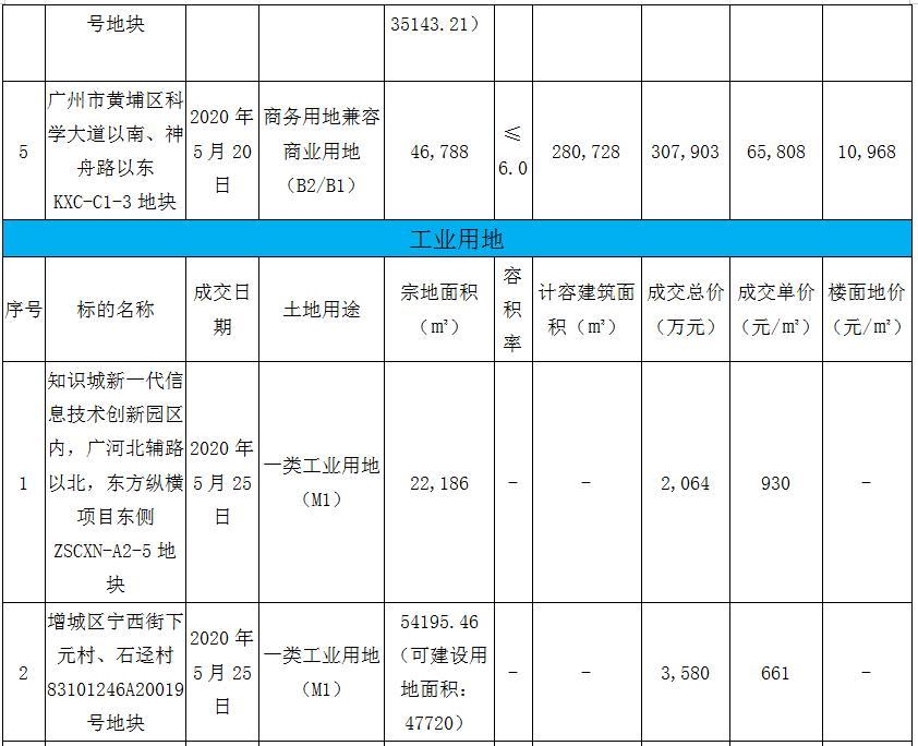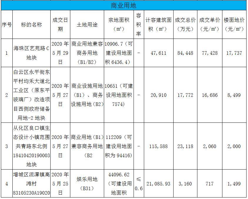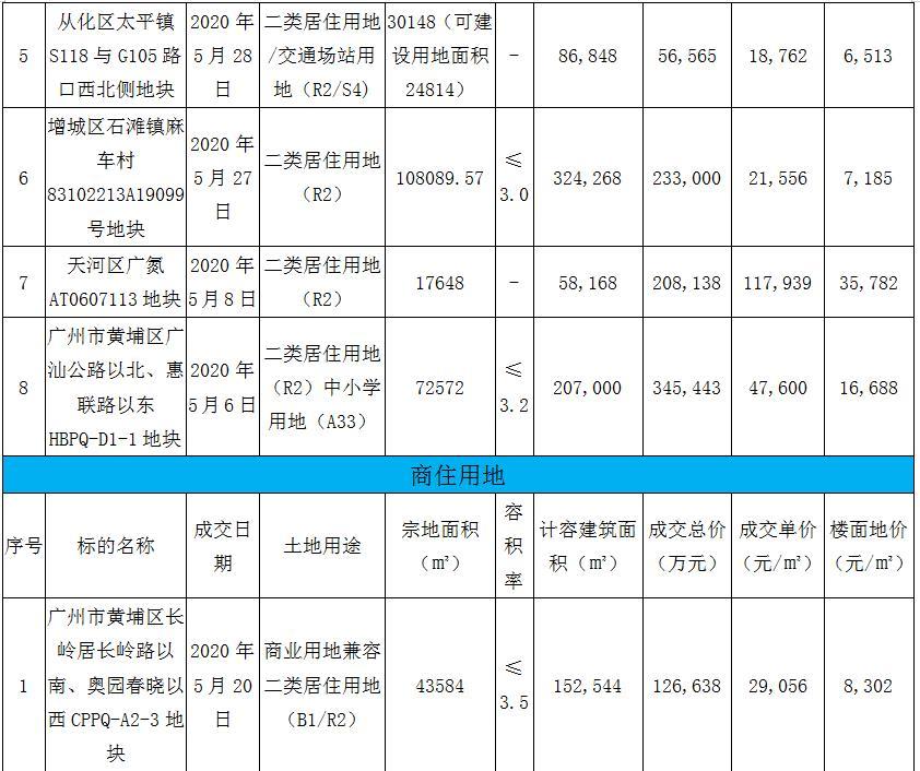 据广州市公共资源交易网数据,2020年5月广州市公开出让成交各类宗地共19宗,其中住宅用地8宗、商住用地1宗、商业用地5宗、工业用地5宗,涵盖区域有增城、白云、从化、黄埔、天河、海珠、番禺、知识城等区域。