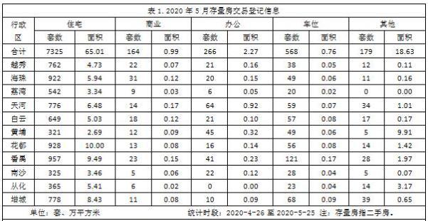 (1)住宅房地产市场。据广州市住房和城乡建设局存量房交易登记统计信息显示,5月(2020年4月26日至2020年5月25日)广州市二手住宅共成交7325套,成交面积为65.01万㎡,较4月二手住宅成交增加624套,成交面积增加6.75万㎡。