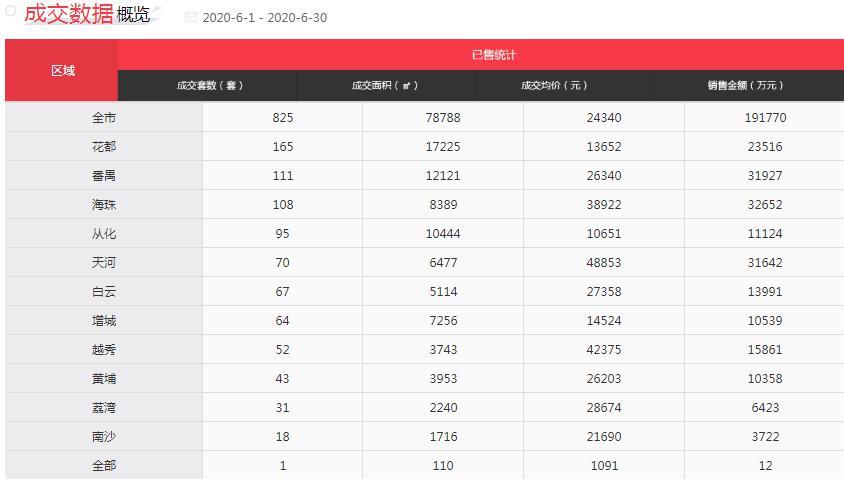 其中,花都区以165套的成交套数位列榜首,而天河区则以48853元/㎡的成交均价夺得全市楼价之冠。