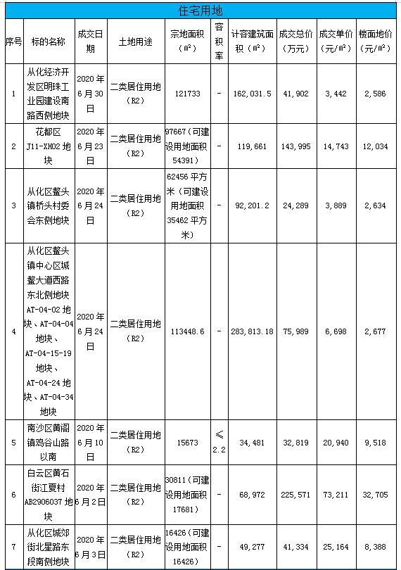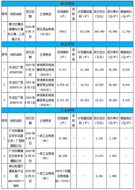 据广州市公共资源交易网数据,2020年6月广州市公开出让成交各类宗地共14宗,其中住宅用地7宗、商业用地3宗、商住用地1宗、工业用地3宗,涵盖区域有花都、南沙、白云、黄埔、天河、从化等区域。