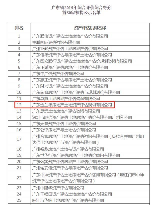 广东金兰德房地产土地资产评估规划有限公司于2019年度广东省资产评估综合得分排名位列第十二。