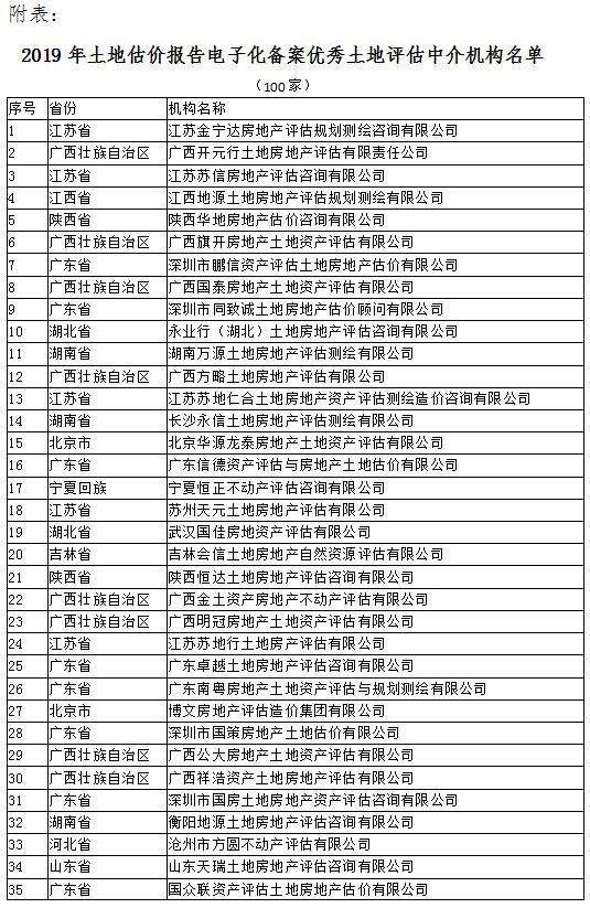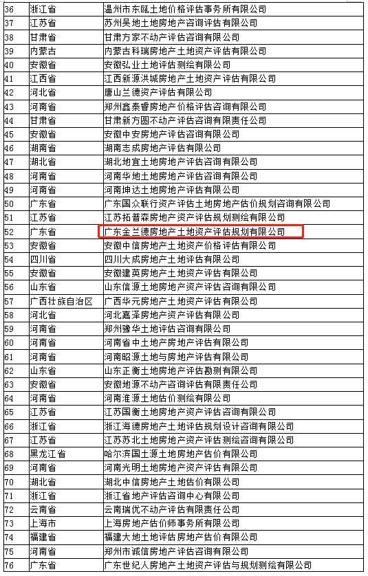 2020年10月10日,中国土地估价师与土地登记代理人协会官网公布了中估协发〔2020〕32号关于印发公布2019年土地估价报告电子化备案优秀土地评估中介机构的通知:2019年,全国共有3158家机构进行了报告备案,共备案报告25万余份,经对各机构备案报告数量、面积、评估额和评估收费额等参数进行评定,广东金兰德房地产土地资产评估规划有限公司等100家土地评估中介机构获评“2019年土地估价报告电子化备案优秀土地评估中介机构”称号。信息记入土地估价行业诚信档案,并将在2020年A级资信评级、行业评优等工作中给予加分。具体名单如下: