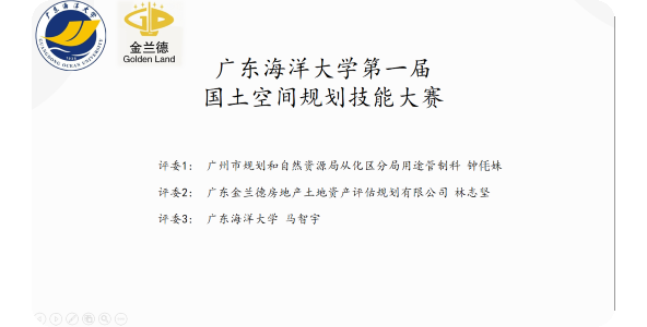 2021年4月24日,由广东海洋大学管理学院主办,广东金兰德房地产土地资产评估规划有限公司赞助的第一届国土空间规划技能大赛决赛在腾讯会议顺利举行。本次大赛邀请了广州市规划和自然资源局从化区分局用途管制科副科长钟毛妹、广东金兰德房地产土地资产评估规划有限公司总经理林志坚、管理学院马智宇老师作为评委对各组作品进行点评。