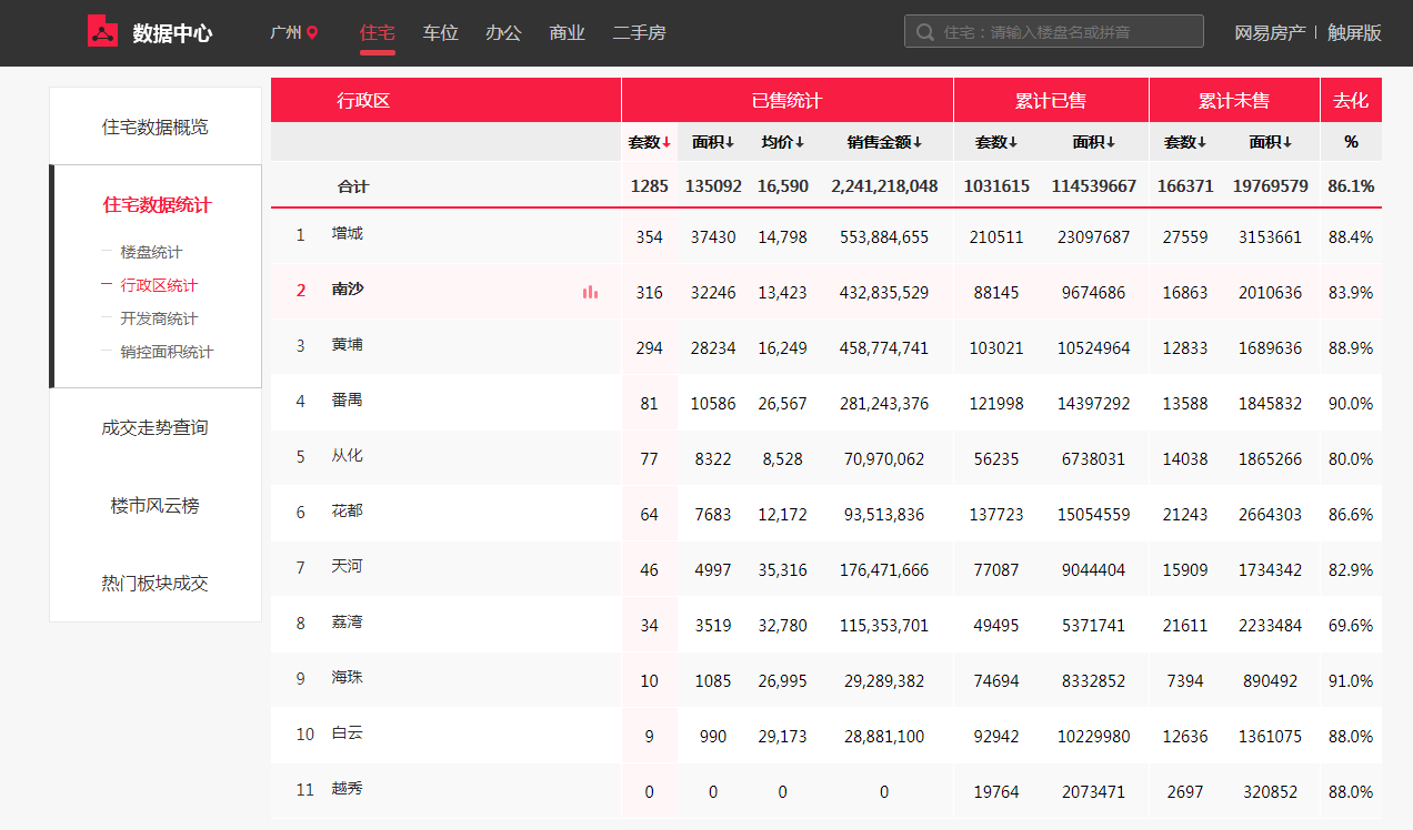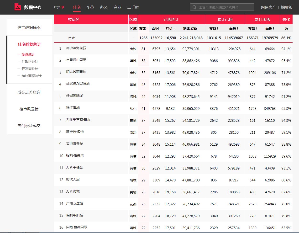 细化到楼盘销售方面,上榜楼盘中,黄埔、南沙、增城的楼盘称霸榜单。南沙滨海花园、合景誉山国际以及阳光城丽景湾分列榜单前三位,而中心区无一上榜。