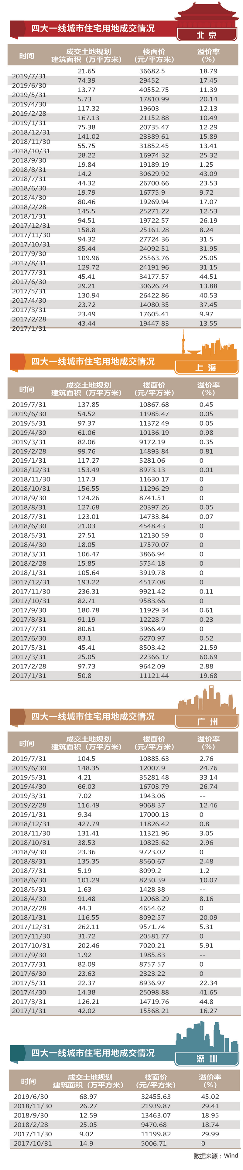 上海的调控政策同样不手软。2017年4月开始,包括土拍实行招标复合,办公、商业属性土地不得再建类住宅,开盘商品住房摇号限售,银行贷款利率上浮,严控企业购房等。受调控影响,上海住宅价格指数月度涨幅从2016年10月的27.5%直落到2019年7月的-0.24%。