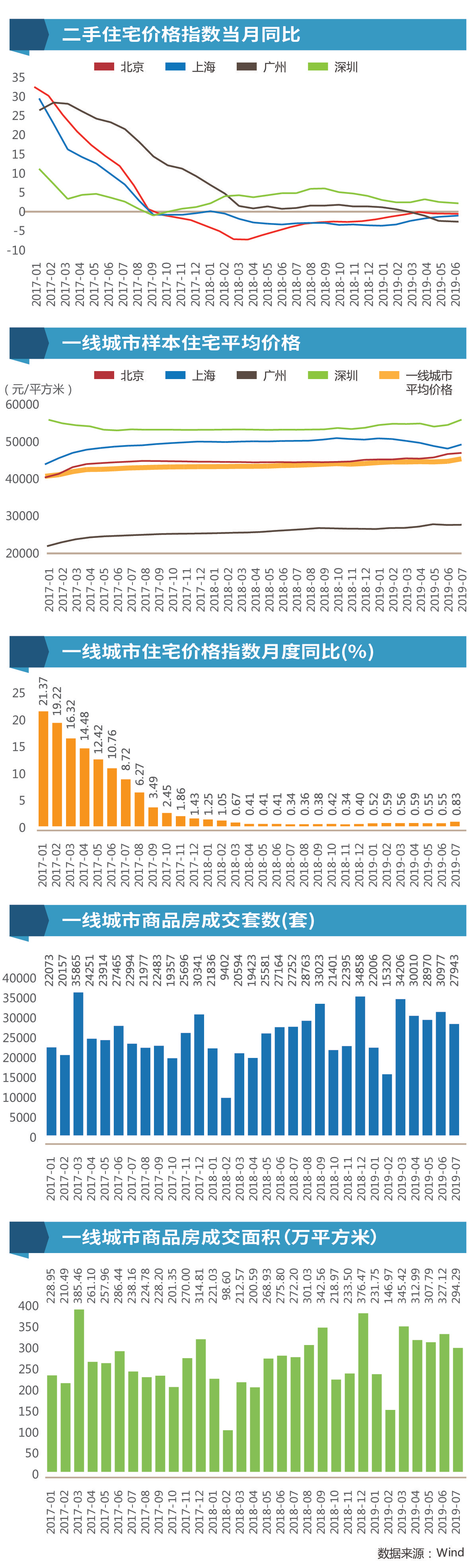 从房价统计看,根据wind数据统计,今年6月份深圳、上海、北京、广州商品住宅成交价格分别为53337元/平方米、53013元/平方米、49032元/平方米和25548元/平方米,其中深圳、上海、北京分列城市房价前三。涨幅方面,一线城市商品房价6月份同比涨幅0.55%,7月份同比涨幅0.83%。另据中国社科院财经战略研究所发布6月《中国住房市场发展月度分析报告》, 一线城市新房价格平均环比下跌0.615%。其中广州环比下跌0.86%,北京环比微跌0.48%,深圳环比下跌0.98%,上海环比微跌0.14%。虽然不同机构统计口径略有差别,但从总体趋势上看,一线城市房价停涨甚至转跌的趋势基本确立。