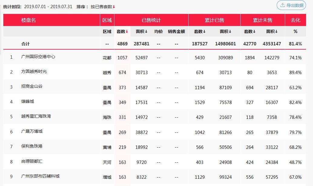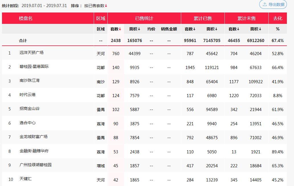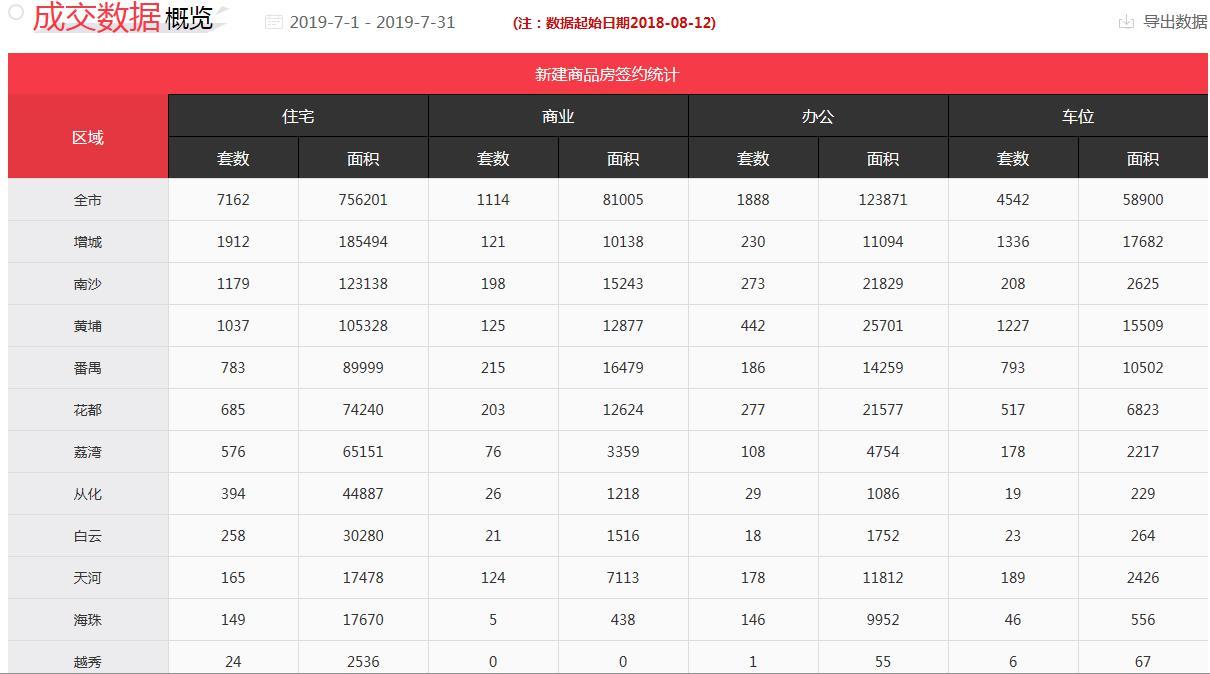 (3)办公房地产市场。据网易房产数据中心显示,7月广州市成交新建写字楼成交套数为1888套,成交面积为12.39万㎡。其中,黄埔、花都、南沙成交分列前三位。