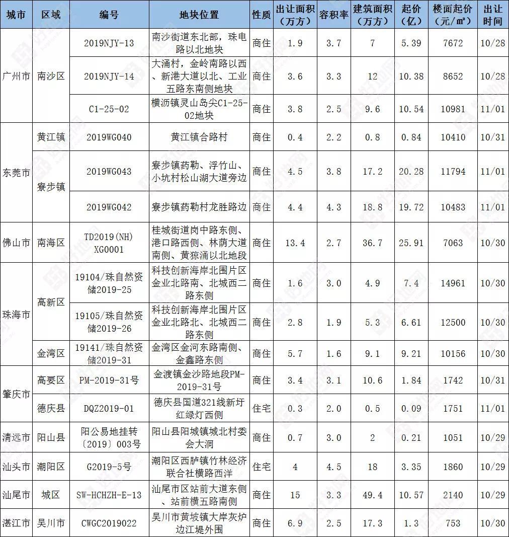 16宗地分布于广州(3宗)、东莞(3宗)、佛山(1宗)、珠海(3宗)、肇庆(2宗)、清远(1宗)、汕头(1宗)、汕尾(1宗)、湛江(1宗)。