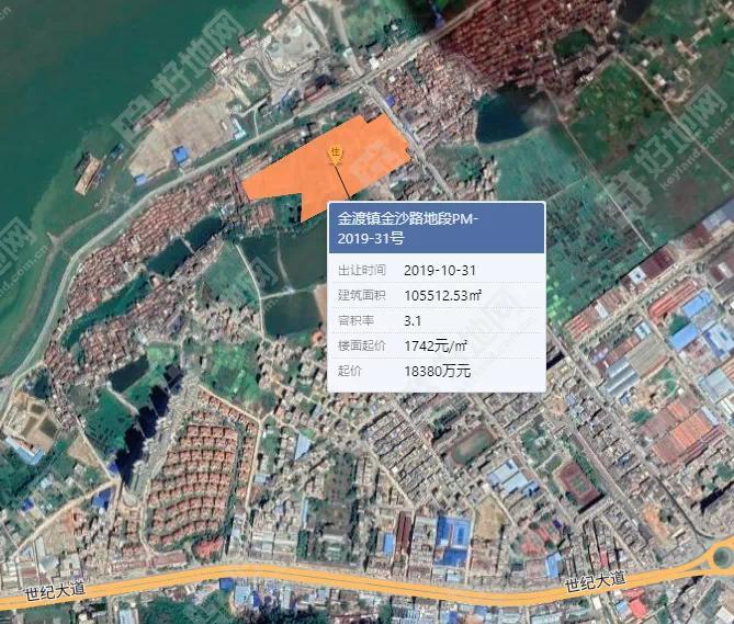 地块位于金渡镇金沙路地段,出让面积34036.30㎡,最大容积率为3.1,最大计容建面105512.53㎡。