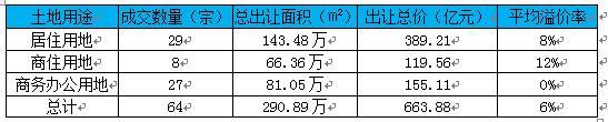截至今年11月16日,广州市共出让土地64宗(不含工业用地),其中,纯住宅用地29宗,总出让面积143.48万㎡,总成交价389.21亿元,商住用地8宗,总出让面积66.36万㎡,总成交价119.56亿元,商务办公用地27宗,总出让面积81.05万㎡,总成交价155.11亿元。